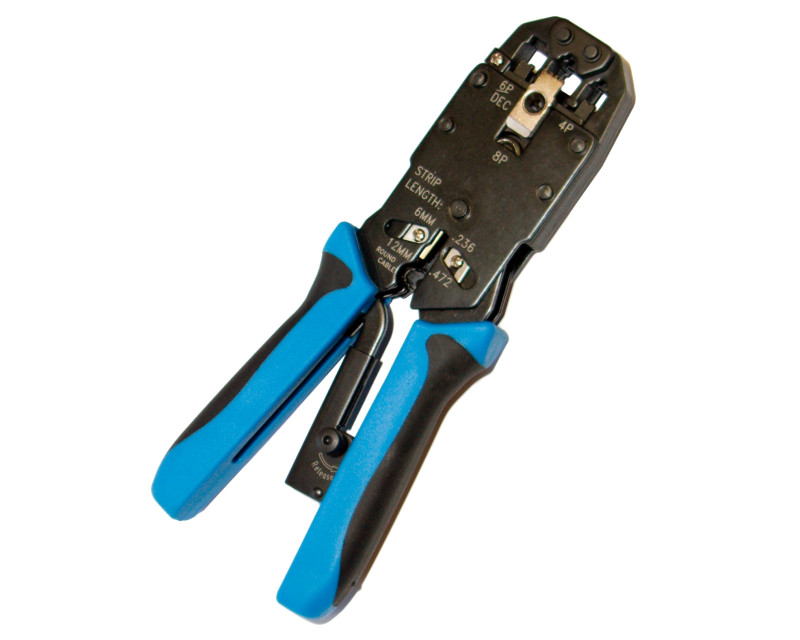 Kleště lisovací 4/6/8 celokovové s račnou pro konektory 4/4 , 6/6, 8/8 Modré měkčené rukojeti s vestavěným striperem na kulatý kabel,