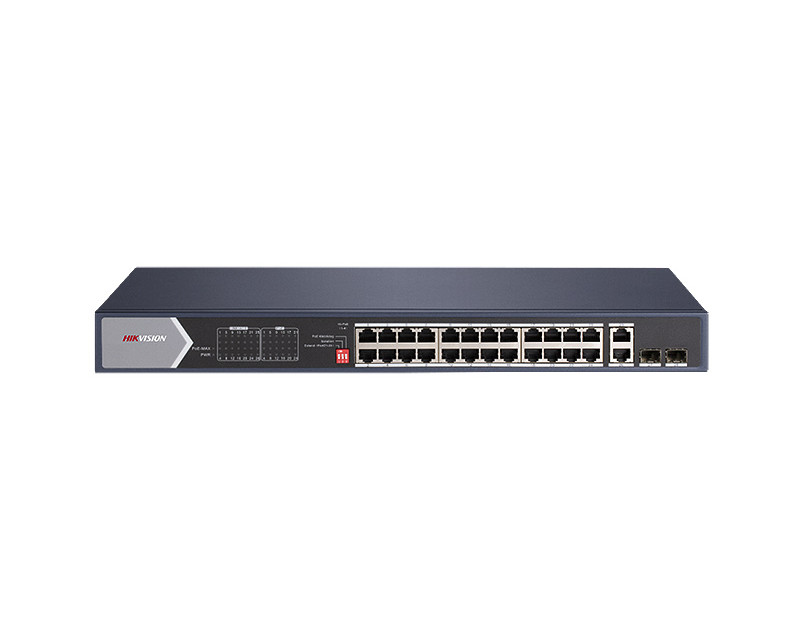 Switche a POE napájení HikVision 28 portový switch - 4x HiPoE 90W 1Gbps + 20x PoE 30W 1Gbps + 2x uplink RJ-45 1Gbps + 2x uplink SFP slot 1Gbps, PoE celkem max. 370W, bez managementu, prodloužený režim (porty 21 - 24), kovové šasi, stavové LED, hmotnost 2.98kg, rozměry 440 x 44 x 221mm 19" 1U, provozní teploty -10°C až +55°C, napájení 230VAC 30W
