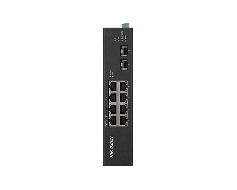 Switche a POE napájení HikVision 10 portový průmyslový switch - 2x HiPoE 90W 1Gbps + 6x PoE 30W 1Gbps + 2x uplink SFP slot 1Gbps, PoE celkem max. 110W, bez managementu, prodloužený režim (porty 7 - 8), kovové šasi, bez ventilátoru, stavové LED, rozměry 197 x 114 x 42mm, instalace na DIN lištu, provozní teploty -30°C až +65°C, hmotnost 0.6kg, napájení 48-57VDC 10W