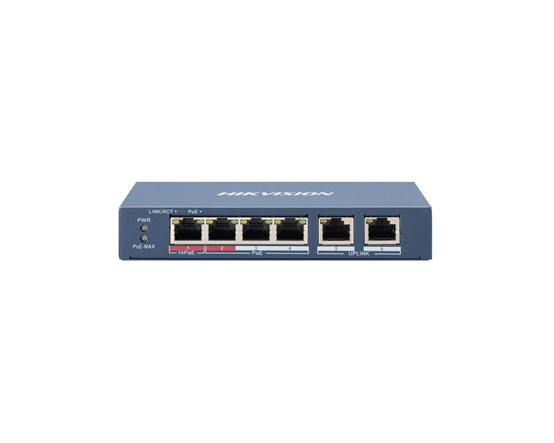 Switche a POE napájení HikVision 6 portový switch - 1x HiPoE 60W 10/100Mbps + 3x PoE 30W 10/100Mbps + 2x uplink RJ-45 10/100Mbps, PoE celkem max. 60W, bez managementu, prodloužený režim (porty 1 - 4), kovové šasi, bez ventilátoru, stavové LED, hmotnost 0.24kg, rozměry 145 x 26 x 69mm, provozní teploty -10°C až +55°C, napájení 48VDC 5W, zdroj součástí