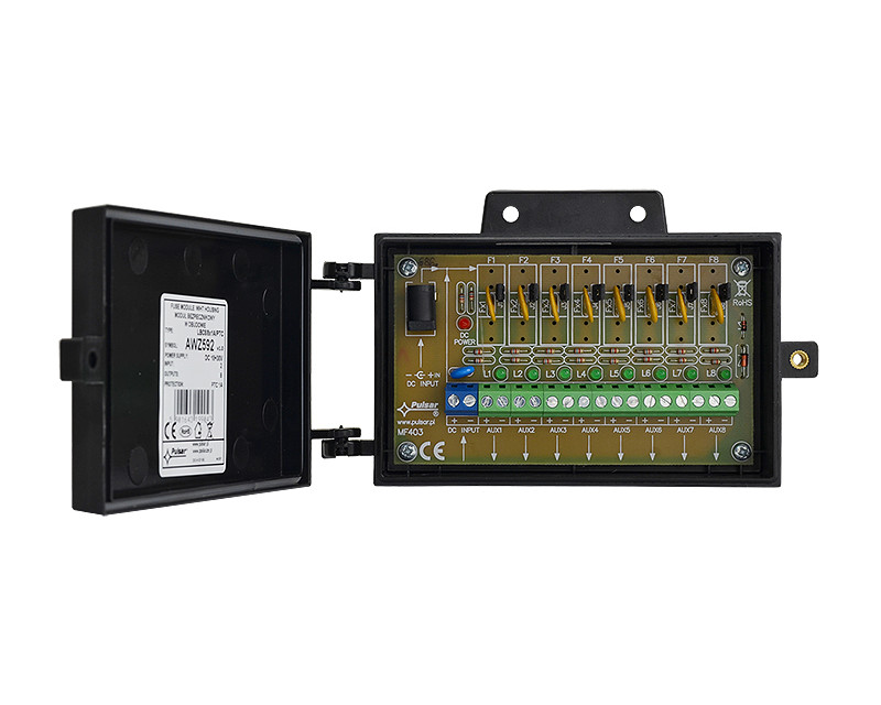 Pojistkové moduly Pulsar uzaviratelný pojistkový modul v ABS krytu, vstupní napětí 10-30V DC, počet vstupů/výstupů 1/8, výstupní proud 8x 1A, ochrana: SCP, OLP, proti přepětí, Dodatečné funkce: dodatečný vstup napájení, zásuvka DC 5.5/2.1, optická signalizace LED, rozměry: W=126 H=78+16 D=42 mm