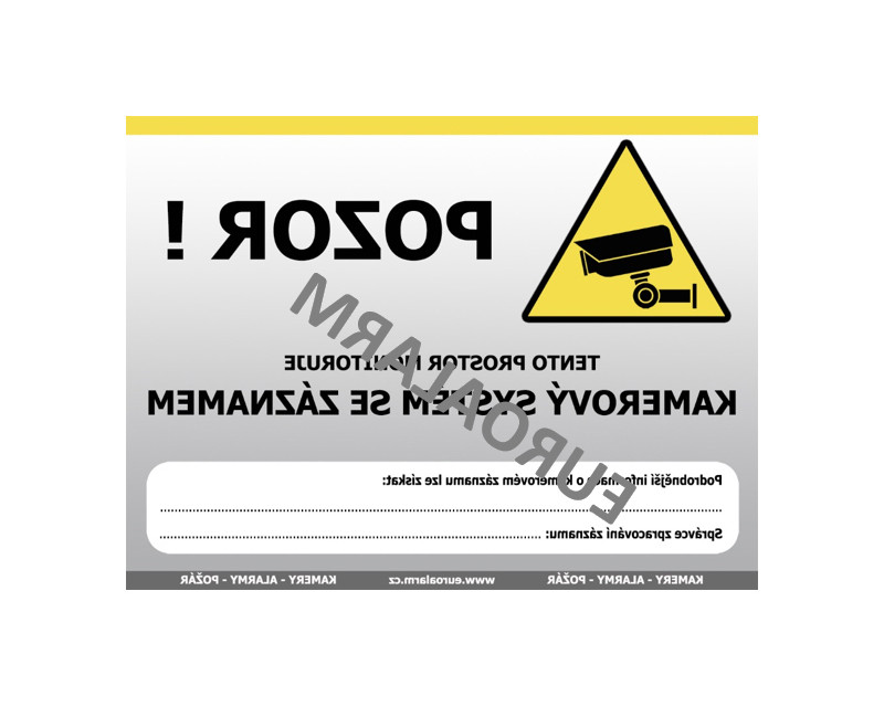 Dokumentace k CCTV EUROALARM spol. s r.o. Povinné označení monitorovaného prostoru. Text: "Tento prostor monitoruje kamerový systém se záznamem" + prostor pro kontaktní údaje. Šikmý vodoznak je pouze na fotografii. Rozměry: 100 x 66 mm. (pod sklo, vnitřní strana)