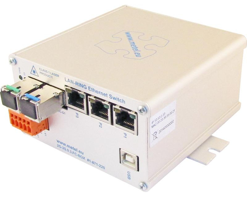 IP METEL s.r.o. 2G-2S.0.3.FC-BOX, Průmyslový switch pro kruhovou topologii s 2x SFP slot, 3x FE port, redundantní vstup napájení, jemné přepěťové ochrany, EVENT MANAGEMENT: SMTP, TCP eventy, ETH eventy, HTTP klient (řízení kamer), 8x IPWatchdog.... , provozní teplota –40…+70°C, VLAN, QoS, IGMP, SNMPv2/v3, SNTP, instalace na rovný podklad nebo DIN35, 12VDC/24VDC/48VDC/12VAC/24VAC/56VDC