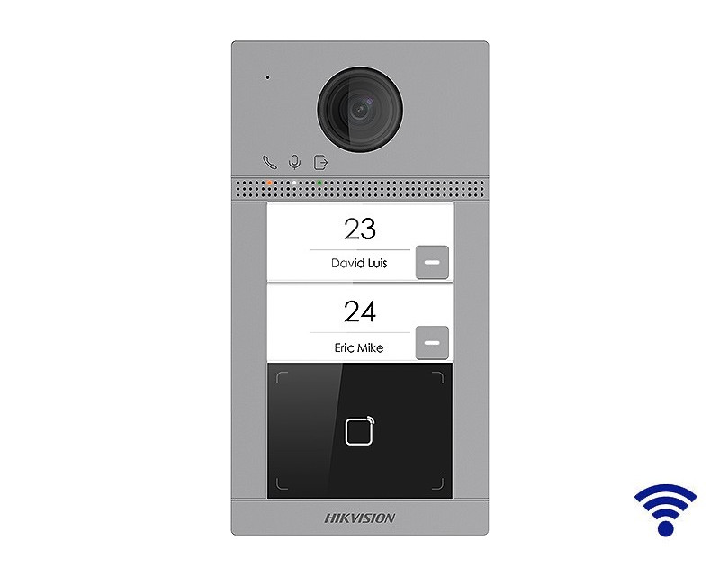 Kompaktní venkovní jednotky HikVision Dveřní stanice s kamerou a 2x tlačítkem, WIFI, povrchová montáž, antivandal, RFID čtečka Mifare (13.56 MHz), napájení 12 VDC/POE, 2x výstup pro ovládání dveří