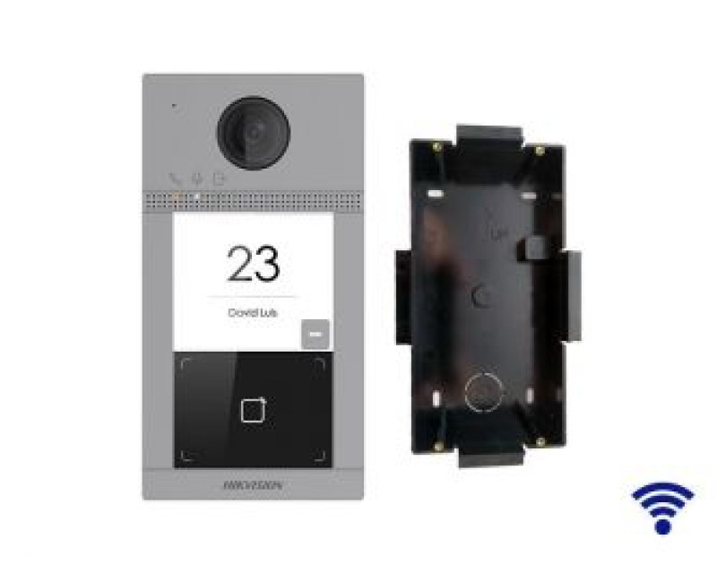 Kompaktní venkovní jednotky HikVision Dveřní stanice s kamerou a 1x tlačítkem, WIFI, zápustná montáž, antivandal, RFID čtečka Mifare (13.56 MHz), napájení 12 VDC/POE, 2x výstup pro ovládání dveří