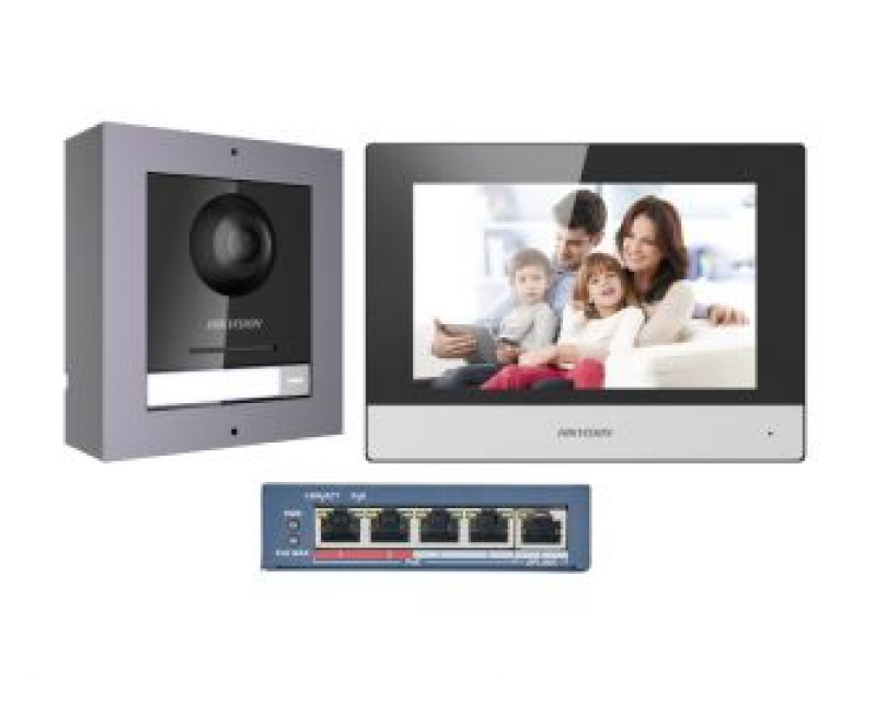 Sety IP videotelefonů HikVision Sada IP videotelefonu. Obsahuje: venkovní jednotku DS-KD8003-IME1/Surface + monitor DS-KH6320-WTE1 + switch DS-3E0105P-E/M(B) + 16GB micro SD kartu