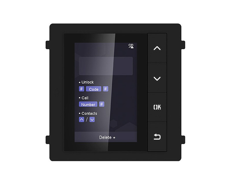 Sub-moduly HikVision Video Intercom 2. generace, 3.5" LCD displej, rozlišení 320x480px, 4 podsvícená tlačítka, lze přidat až 2000 kontaktů, vyhledání v seznamu kontaktů, zobrazení zadávaných číslic klávesnicí, 2.5W, IP65, IP65, 2x RS-485, barva černá