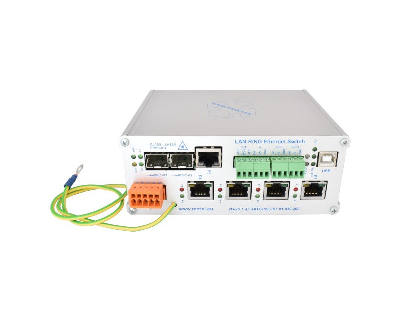 IP METEL s.r.o. 2G-2S.1.4.F-BOX-PoE-PP, Průmyslový switch pro kruhovou topologii s 2x SFP slot, 1x GE port, 4x Fast Ethernet port s PoE, podpora UPOE, POH, 802.3af/at/bt, max. 95W na port, maximální celkový odebíraný výkon PoE přes všechny porty je 170W, přepěťové ochrany FE portů 1000A, 2x DI s podporou vyvážených smyček, 1x programovatelné NO/NC RELÉ výstup, 2x RS485 / 1x RS422 BUS (podpora MIOS modulů, TCP server, UDP mode), USB port pro lokální management, redundantní vstup napájení, přepěťové ochrany na všech vstupech, EVENT MANAGEMENT: SMTP, TCP eventy, ETH eventy, HTTP klient (řízení kamer), 8x IPWatchdog.... , provozní teplota –40…+70°C, VLAN, QoS, IGMP, SNMPv2/v3, SNTP, instalace na rovný podklad nebo DIN35, 12VDC/24VDC/48VDC/12VAC/24VAC/56VDC