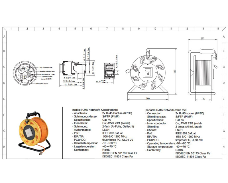 Vysoce kvalitní, stíněný, bez halogenů (LSZH) CAT 7A S/FTP kabel, umístěný na robustní přenosné cívce s možností odvíjení. Kabel je ideální pro mobilní použití, jako je například na akcích, prezentacích či školeních. Ideální pro krátkodobé LAN připojení na dlouhé vzdálenosti, jako je měření sekcí nebo ve venkovních přenosových vozech.