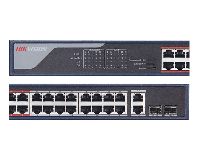 Switche a POE napájení HikVision 24x POE | 24 x 100 Mb | 2x 1Gb Combo port | výkon 370 W | bez managementu | dosah až 250 m / 10 Mb