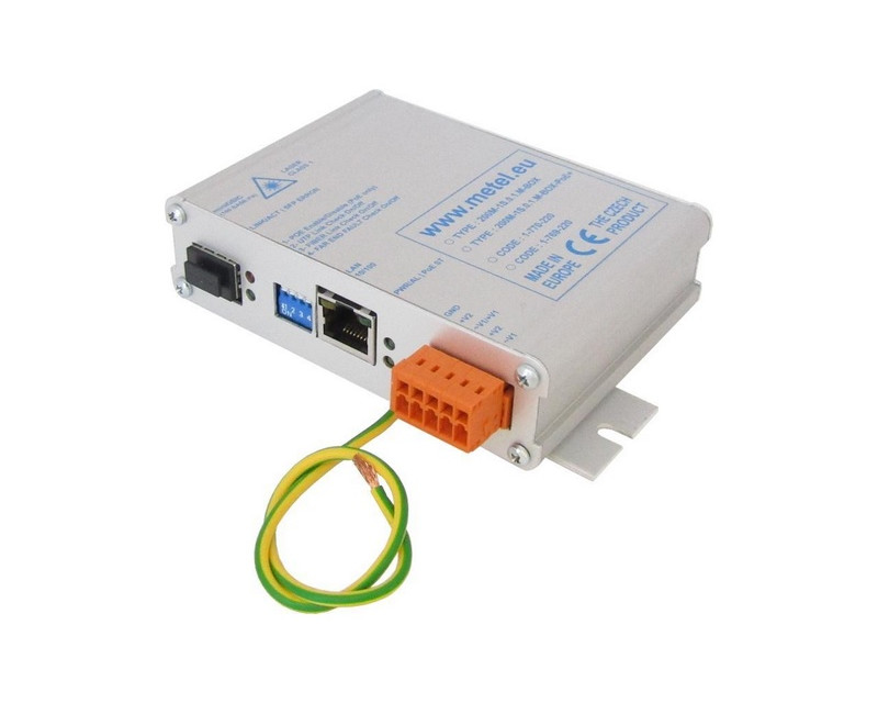 IP METEL s.r.o. 200M-1S.0.1-BOX-PoE+, Průmyslový media konverotor s podporou PoE+ (25.5W), SFP slot s podporou 100BASE-X, Podpora FAR END FAULT, Detekce odpojení optického/FTP kabelu, Přepěťová ochrana 1000A, instalace na rovný podklad nebo DIN35, 12VDC/24VDC/48VDC/12VAC/24VAC