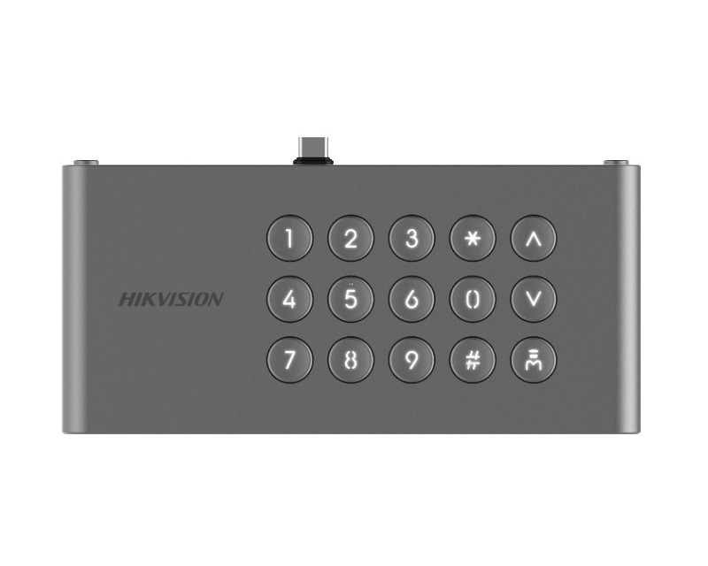 Kompaktní venkovní jednotky HikVision Přídavný modul klávesnice pro dveřní jednotky řady DS-KD9633, 15 tlačítek, podsvícení, připojení pomocí USB C, IP65, IK07, provozní teploty -30°C až 60°C, napájení z dveřní jednotky, rozměry 159 x 74 x 29mm, materiál hliník a plast