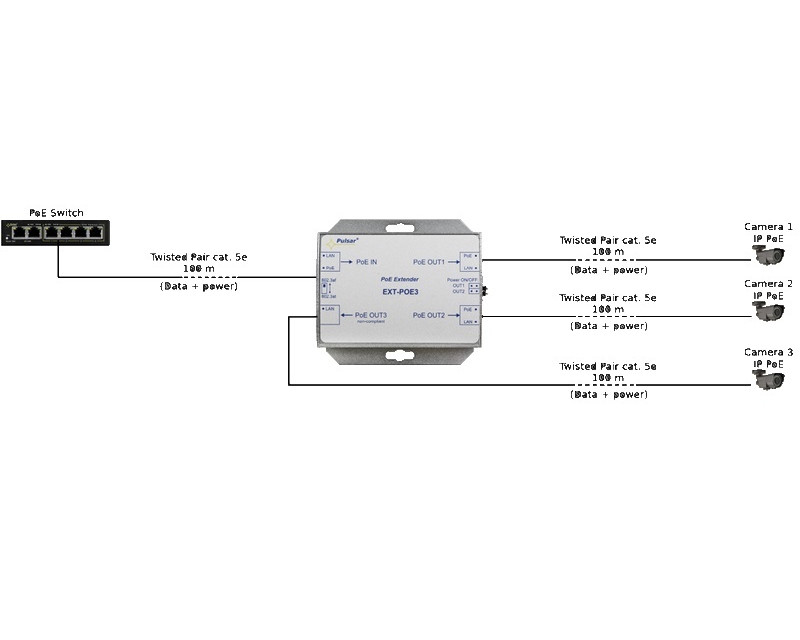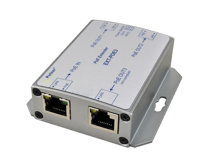 POE extendery Pulsar LAN a PoE extender, 1x RJ-45 vstup, 3x RJ-45 výstup, LAN 10/100Mbps, vstup PoE 802.3af/at, výstupy 1 a 2 PoE 802.3af, výstup 3 pasivní PoE, max. celkem 30W, prodloužení o max. 100m UTP cat5/5e, vlastní spotřeba <30mA, ochrana proti přetížení a zkratu, stavové LED, provozní teploty -10°C až +40°C, rozměry 81 x 77 x 26mm, možnost vypnutí PoE na výstupech 1 a 2 pomocí jumperů