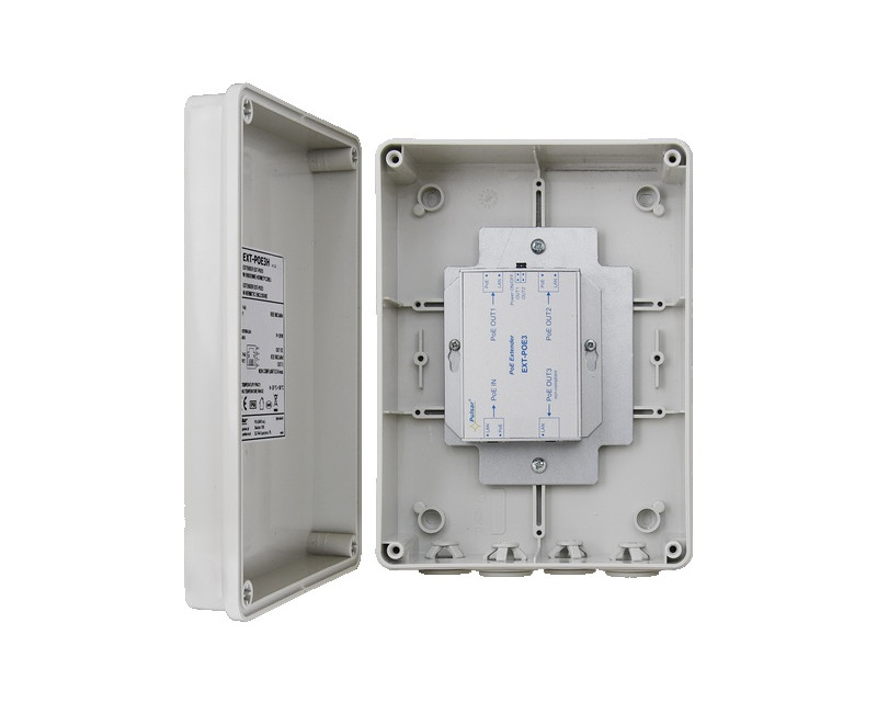 POE extendery Pulsar LAN a PoE extender, 1x RJ-45 vstup, 3x RJ-45 výstup, LAN 10/100Mbps, vstup PoE 802.3af/at, výstupy 1 a 2 PoE 802.3af, výstup 3 pasivní PoE, max. celkem 30W, prodloužení o max. 100m UTP cat5/5e, vlastní spotřeba <30mA, ochrana proti přetížení a zkratu, stavové LED, provozní teploty -25°C až +50°C, rozměry 158 x 118 x 77mm, možnost vypnutí PoE na výstupech 1 a 2 pomocí jumperů, ve venkovním boxu IP56