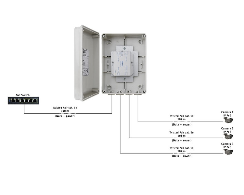 | LAN a PoE extender, 1x RJ-45 vstup, 3x RJ-45 výstup, LAN 10/100Mbps, vstup PoE 802.3af/at, výstupy 1 a 2 PoE 802.3af, výstup 3 pasivní PoE, max. celkem 30W, prodloužení o max. 100m UTP cat5/5e, vlastní spotřeba <30mA, ochrana proti přetížení a zkratu, stavové LED, provozní teploty -25°C až +50°C, rozměry 158 x 118 x 77mm, možnost vypnutí PoE na výstupech 1 a 2 pomocí jumperů, ve venkovním boxu IP56 | |