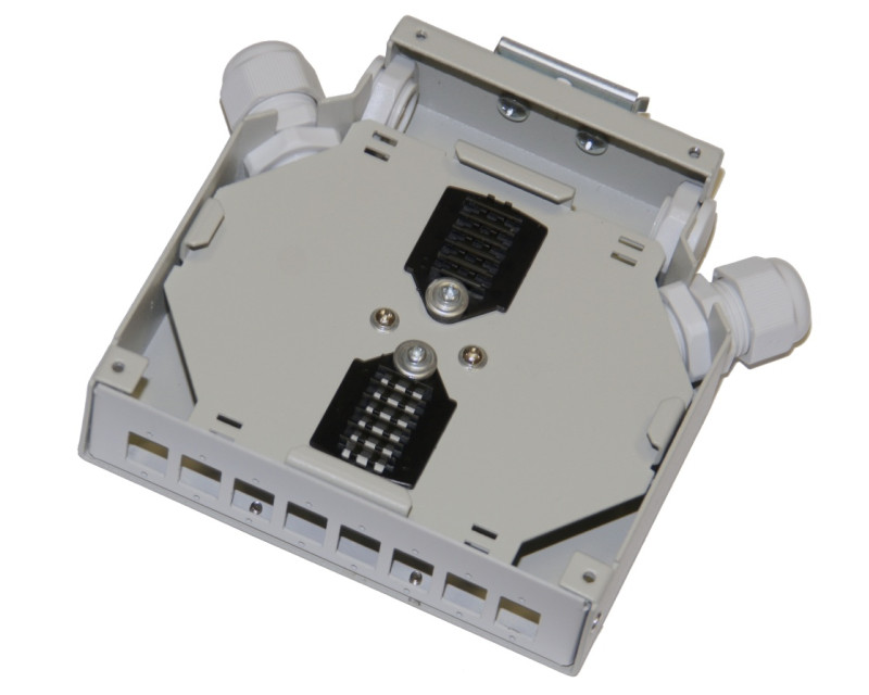 Optický box na DIN lištu kovový pro zakončení či provaření až 12 vláken. Čelo 8x SC simplex (E2000, LC Duplex) , vybavený držáky svárů - 2ks 6 sv. , kabelová průchodka PG 2ks, záslapka PG 2ks)