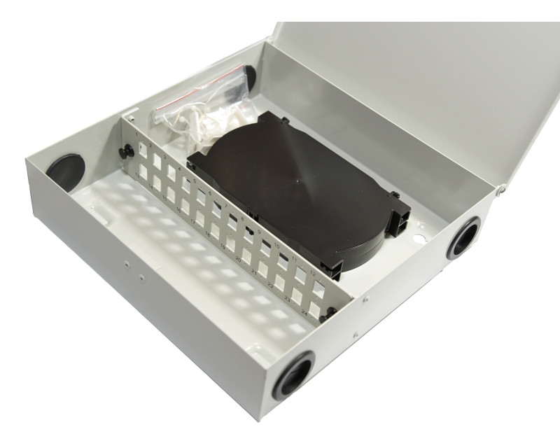 Rozvaděč kovový optický jednokřídlý se zámkem vybavený čelem pro 24x SC (24x LC Duplex, 24x E2000)