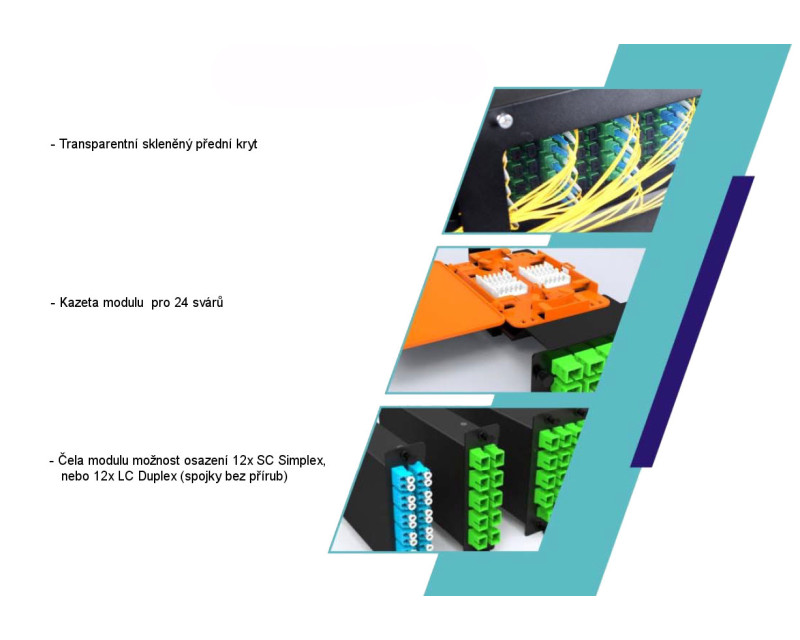 Vybavený 12x vertikálním panelem ve slotu s kazetou na 24 svárů, prostor pro stočení vláknové rezervy s háčky a čelem pro 12x spojka SC simplex (E2000, LC duplex) - spojky bez příruby