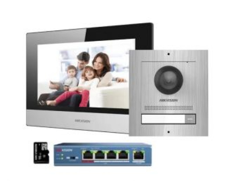 Sety IP videotelefonů HikVision Sada IP videotelefonu: 1x Dveřní jednotka DS-KD8003-IME1/Surface/S, 1x vnitřní jednotku DS-KH6320-WTE1, 1x switch DS-3E0105P-E/M(B), 1x 16GB MicroSD