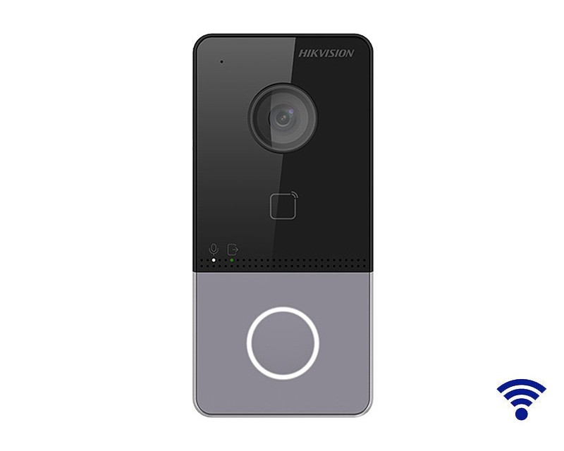 Kompaktní venkovní jednotky HikVision 2 Mpx Villa 1 tlačítková, dveřní stanice, Plastové šasi, Rozlišení kamery: FullHD, 25fps, úhel záběru 131° x 78°, WDR, 10M/100M Auto-adaptabilní Ethernet, Wi-Fi 802.11b/g/n, RS-485, 4x popl. vstup, 1x výstup pro zámek, IP65, napájení: 12 VDC/PoE - 10W, Mifare card modul, 1-k Vnitřní přístupová stanice, IR přísvit, rozměry: 138 x 65 x 27mm, povrchová montáž