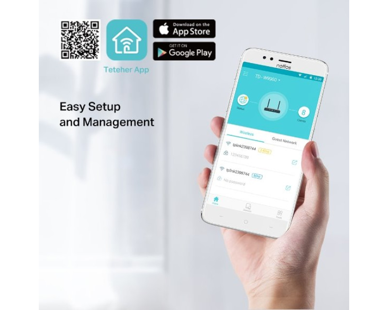 Modem/router TD-W9960 nastavíte během několika minut díky intuitivnímu webovému rozhraní a výkonné mobilní aplikaci Tether. Oba způsoby vám z jakéhokoli zařízení s operačními systémy Android nebo iOS umožňují spravovat nastavení sítě, včetně rodičovské kontroly a řízení přístupů. Svou domácí síť máte pod kontrolou kdykoli a odkudkoli.