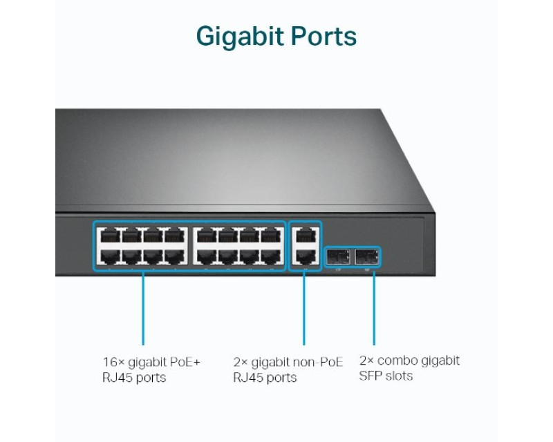 - 16 gigabitových portů s PoE napájením + porty RJ45, 2 gigabitové porty