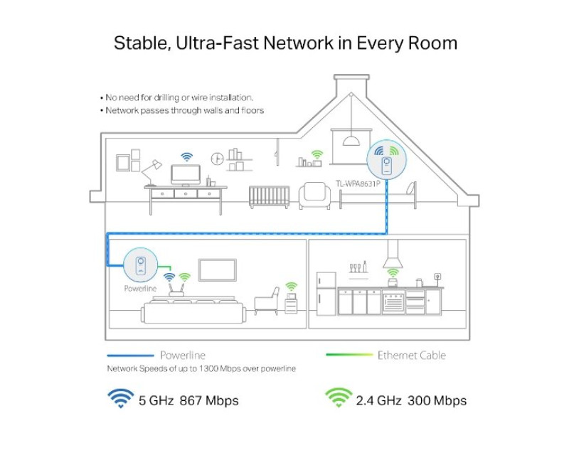 300 Mb/s v pásmu 2,4 GHz mohou uživatelé bez obtíží rozšířit svou datovou síť prostřednictvím stávající elektrické sítě a vysílat do dalších částí domácnosti či kanceláře bezdrátový signál, který mohou sdílet všechny vaše Wi-Fi zařízení.