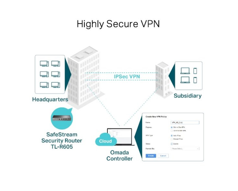Router TL-ER605 podporuje tzv. „pass-through“ datový provoz využívající několik VPN protokolů, včetně IPsec, PPTP a L2TP v režimu klient/server. Navíc má vestavěný hardware podporující VPN, díky němuž je router schopen podporovat a spravovat až 20 IPsec VPN připojení typu LAN-to-LAN/Client-to-LAN. Mezi vyspělé funkce VPN patří šifrování DES/3DES/AES128/AES192/AES256, autentizace MD5/SHA1. Zařízení má k dispozici 5 gigabitových portů (1x LAN, 1x WAN + 3x volitelný LAN/WAN)