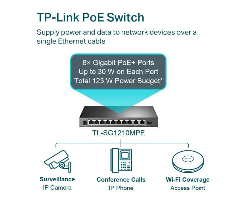 Výkonný PoE přepínač TP-LINK TL-SG1210MPE nabízí 8 GLAN/PoE portů,