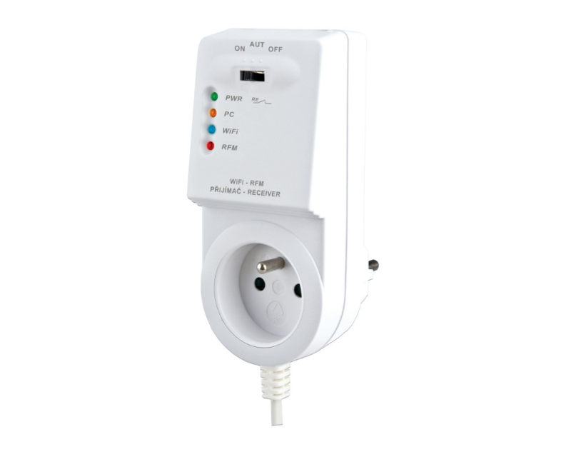 Přenosný vysílač s elegantním stojánkem. V přijímači je implementovaný WiFi modul s interní anténou. Je vhodný ke všem kotlům, které vyžadují bezpotencionální (beznapěťové) spínací kontakty (např. plynové kotle, elektro - kotle, oběhová čerpadla, termoelektrické pohony nebo klimatizační jednotky).