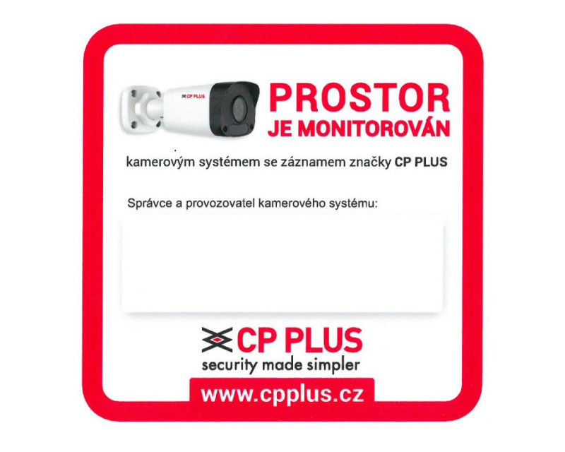 Výstražná samolepka CCTV "PROSTOR JE MONITOROVÁN" * Rozměry 110 x 110 mm * Čtverec * PVC samolepka + ochrana UV laminací i pro venkovní použití * Tvarový výřez * Text: Prostor je monitorován kamerovým systémem se záznamem značky CP PLUS * Místo pro doplnění informací o provozovateli a správci kamerového systému * Ilustrační foto kamery a logo CP PLUS, webová adresa.