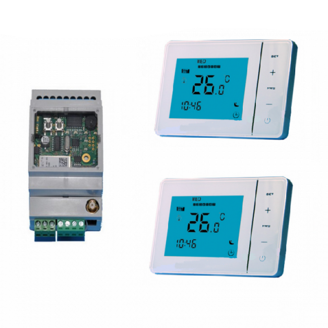 GSM Exeo můžete použít pro dálkové zapnutí a regulaci topení na chalupě, v trvale obydlených domech nebo penzionech. V setu je jeden hlavní RF termostat který umožňuje měnit požadovanou teplotu, přepnout režim topení pro případ kdy se vracíte domu dříve nebo naopak později. Zbylý jeden zónový termostat lze ovládat dle vlastního nastavení umožňují temperování v režimu vypnuto (od 0.5 do 15°C, funkci lze úplně vypnout) a topení v manualním režimu (stále jedna teplota) nebo v programovatelném režimu přepínat během dne mezi dvěma teplotami až 8 změn na den.