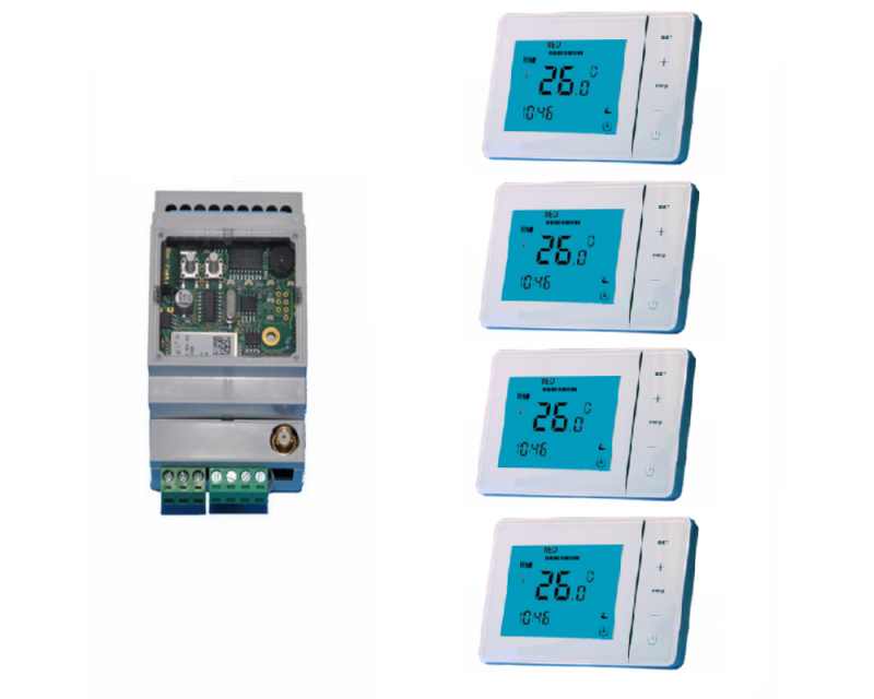 GSM Exeo můžete použít pro dálkové zapnutí a regulaci topení na chalupě, v trvale obydlených domech nebo penzionech. V setu je jeden hlavní RF termostat který umožňuje měnit požadovanou teplotu, přepnout režim topení pro případ kdy se vracíte domu dříve nebo naopak později. Zbylé tři zónové termostat lze ovládat dle vlastního nastavení umožňují temperování v režimu vypnuto (od 0.5 do 15°C, funkci lze úplně vypnout) a topení v manualním režimu (stále jedna teplota) nebo v programovatelném režimu přepínat během dne mezi dvěma teplotami až 8 změn na den.
