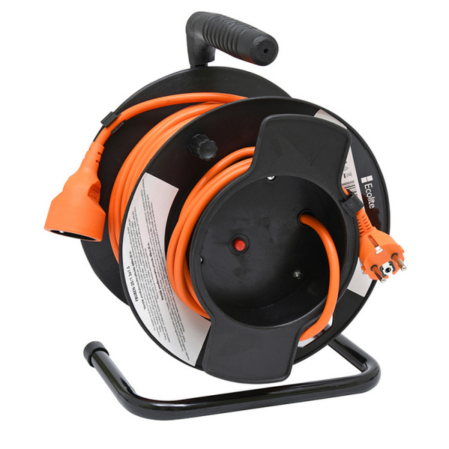 Oranžový prodlužovací kabel na černém navinovacím bubnu pro zapojení zahradní sekačky a jiných zařízení.