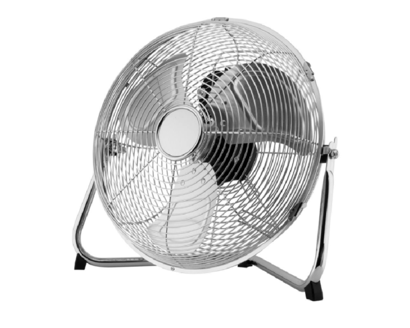 Podlahový chromovaný ventilátor s možností naklápění a třemi stupni výkonu.