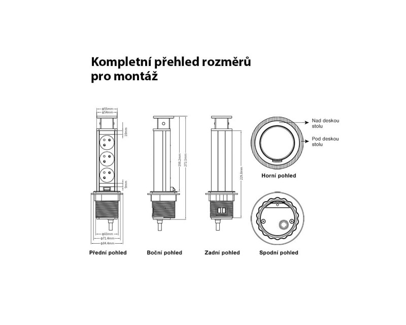 Přípojný zásuvkový sloupek pro desku stolu 3x 230V, pr. 60 mm