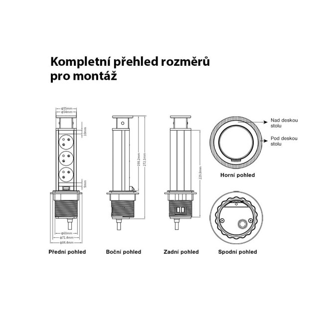 Přípojný zásuvkový sloupek pro desku stolu 2x 230V + USB A 18W + USB C 30W, pr. 60 mm
