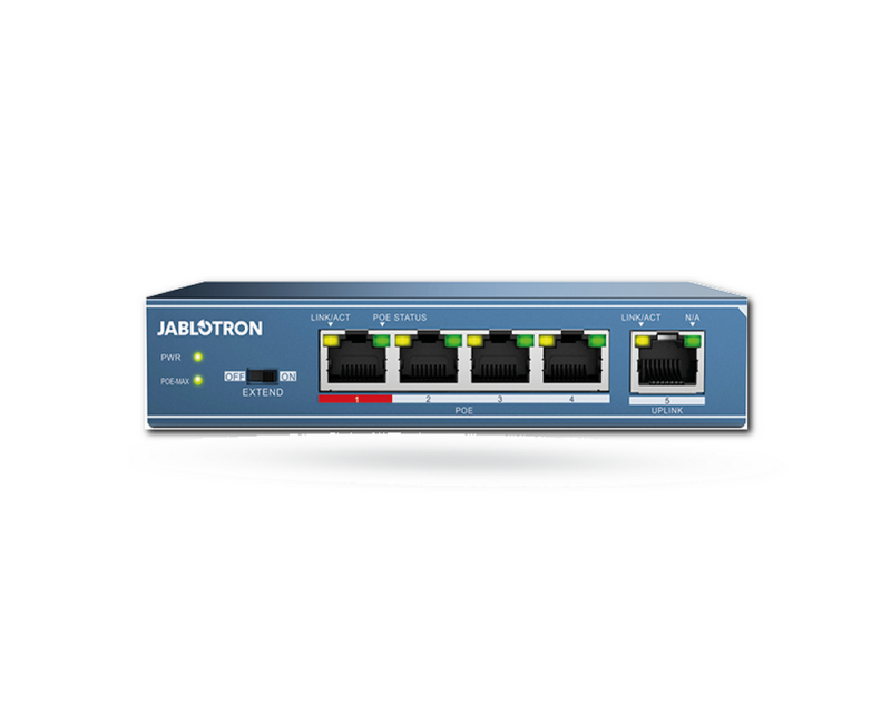 Rozbočovač Ethernetu slouží k snadnému a rychlému rozšíření lokální sítě LAN. Je vybaven čtyřmi výkonnými porty PoE pro datové připojení a napájení IP kamer JABLOTRON jedním kabelem. Rozbočovač podporuje sítě s rychlostí jak 10 Mbps tak i 100 Mbps.