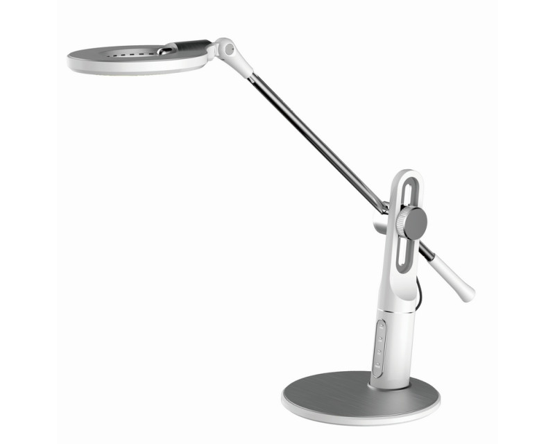 Moderní stmívatelná kancelářská lampička o svítivosti 550Lm pro osvětlení každého pracovního prostoru stolu. Využívá vysoce úspornou SMD LED technologii s dlouhou životností. Na kulaté základně lampy s imitací broušeného hliníku je umístěn dotykový panel s tlačítky i pro stmívání a změnu teploty chromatičnosti.
