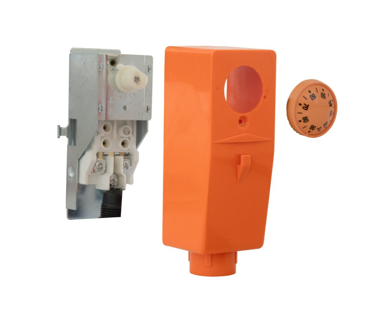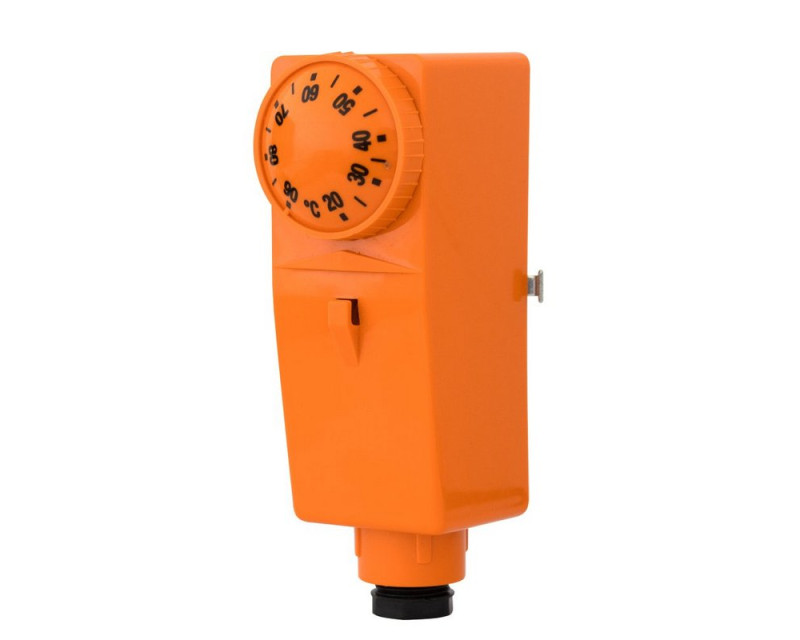 Příložný termostat v kompaktním provedení s bimetalovým čidlem, nastavitelnou teplotou zvenku a montáží přímo na trubku speciální pružinou. Vhodný např. pro podlahová topení, ke spínaní oběhových čerpadel v závislosti na nastavené teplotě a hysterezi.