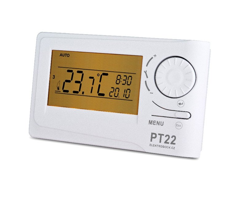 PT22 je prostorový digitální termostat s podsvíceným displejem pro automatickou regulaci vytápění.