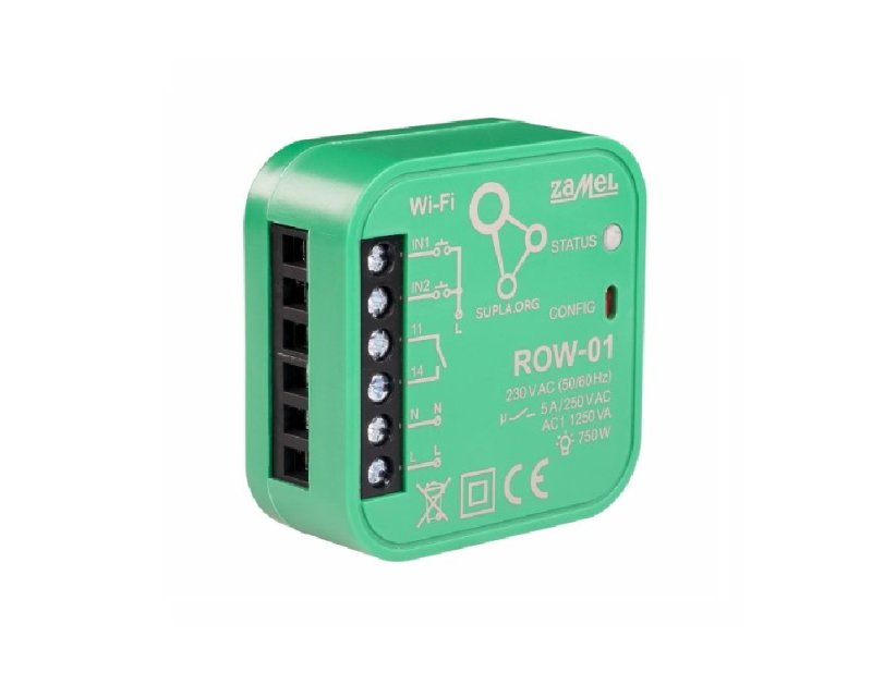 ROW-01 - Wi-Fi spínací 1x5 A modul světel a el. zásuvek, SUPLA, 2 vstupy