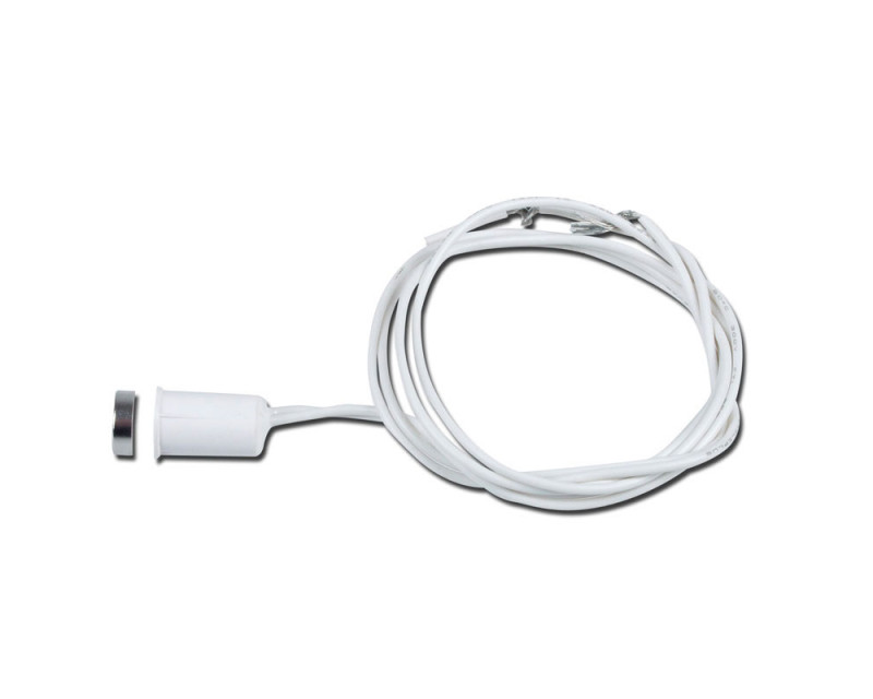 Závrtný miniaturní detektor (poplachový výstup pří rozpojení magnetů – NC rozpojeno) s kabelem EXTRA MĚLKÝ Ø 9 mm, délka magnet 3 mm, relé 14 mm, pracovní vzdálenost max. 19 mm, bílé provedení. Délka kabelu 45cm.