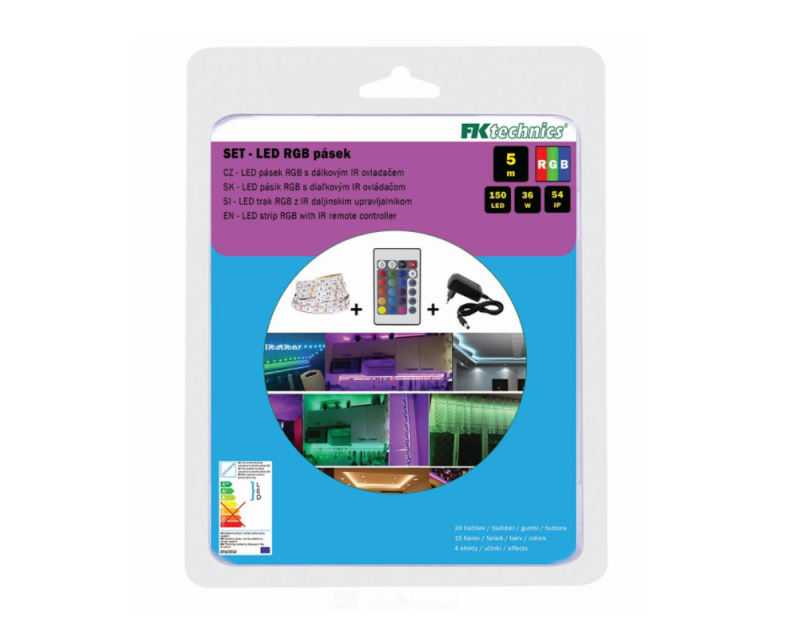 Balení obsahuje: LED pásek 500cm, napájecí zdroj, IR ovladač.