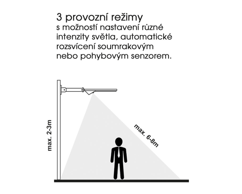 Výrobek je vybaven vlastním výložníkem, který po uchycení na stěnu v omezeném rozsahu umožňuje i nastavení sklonu. Výborně poslouží při osvětlování okolí budov a tam, kde není možnost připojení k elektrické síti, jako jsou např. rekreační objekty, přístupové cesty nebo garáže.